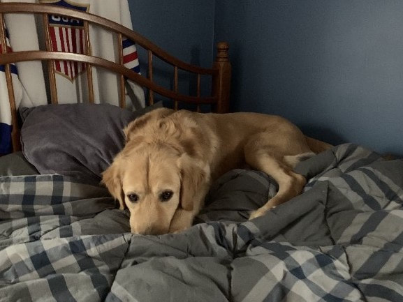 Linda tells us that Ranger is doing great! He loves everyone and is a very loved member of their family, It took him a few weeks to settle in, as he was just perpetually excited! But now he has calmed down and is truly a good boy. Ranger has completed his basic obedience training and learns very quickly. He loves to go for walks and loves cuddles on the couch while chewing one of his bully sticks. He still likes to go in his crate when he needs a nap! He has gained ten pounds and a couple of inches. They had his DNA tested and learned that while he looks like a golden he is actually part lab and part grand Pyrenees. They are grateful to everyone at SGRR for helping to make Ranger a member of their family! Happy life to Ranger, he looks quite comfortable!