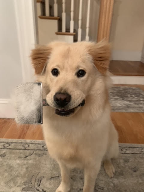 Kim tells us that Remy is doing wonderfully. They feel like Remy has always been a part of their family forever! They love him so much even when he is a total devil!!! He is lucky he is so cute! Remy has adapted to his new routine, he is eating and sleeping well. Especially the eating part! They have been working with a trainer since they adopted him, which has been a great resource for them. He has mastered sit, lie down, crate, paw and wait! They are still working on "leave it" with other dogs and squirrels. He is a quite excitable little puppy who likes to jump up off all four legs into the air. It is quite something, their trainer is wondering if he has a smidge of a border collie in his genetics? He is crate trained and often sleeps in his crate for his naps, and also overnight with the door open so he can move around their room. They leave him in the crate when they have to leave him alone, which he still does not love. He mostly just sits and stares while they are gone with an occasional sad little howl(which they were able to see on the Furbo). Poor Remy! They hope the more they practice leaving him alone for a bit and coming back so that he learns that we will always come back for him. He absolutely loves to play, especially with other dog. He does need to learn some playing manners. Kim said she does not think Remy learns how big he is! He is a bit of an oaf - ha ha! He barks as he is wary of tall men and they are working on that also, but Remy does not know that! They could not be happier to have Remy as part of their little family and cannot thank SGRR enough for bringing him to them. Love the picture of Remy holding his brush! Happy life to Remy! This beauty is Koda who lived with his former family since he was a puppy. His Mom and Dad moved to the Northwest and left Koda in the care of his grandparents, and they realized that Koda needed more activity than they could give him.