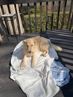 Luna has really taken to Eric. He resigned himself to the fact that we would be foster failures when we agreed to foster Luna. She is very well mannered and let me bathe her and trim her nails with no problem. She is good with our other dogs but does not really engage in play yet. She has a high prey drive and slipped through our wrought iron fence! I knew to watch my son's smaller dog with that but never thought a full-size Golden Retriever would do that! I then spent a good part of the day putting chicken wire all along the fencing to keep her safe! ~ Nancy & Eric